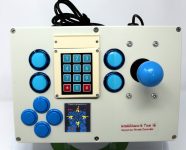 3 independent buttons, arcade style, 30mm, joystick on the right.